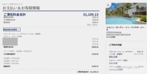 我が家が手配した、「ヒルトン・ガーデン・イン・ワイキキ・ビーチ」の場合、宿泊日の3泊分の料金は1,109ドル≒17.2万円でした。