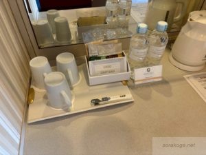 アメニティコーナー。水のボトルと、コーヒー・紅茶のパックなど通常のセットが置かれていました。