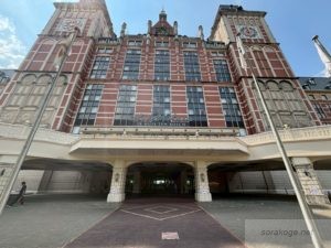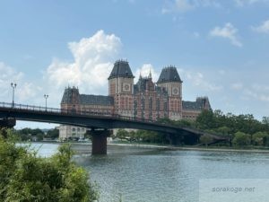 正面から眺めた様子。ヨーロッパを彷彿とさせるような外観で、設計はゴシック様式を取り入れたようにも見えます。