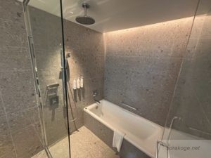 シャワースペース。バスタブはかなり大きめで、足を延ばして余裕でくつろぐことができます。ソープ類はマリオット定番のThisWorksでした。