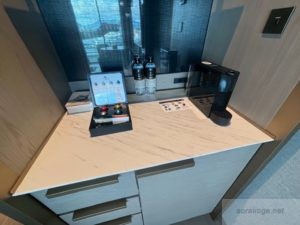 アメニティコーナー。水のボトルが2本と、コーヒーはネスプレッソのカプセルが4つおかれていました。